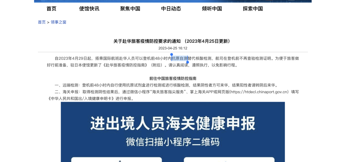 自2023年4月29日起,搭乘国际航班赴华人员可以登机前48小时内抗原自测替代核酸检测