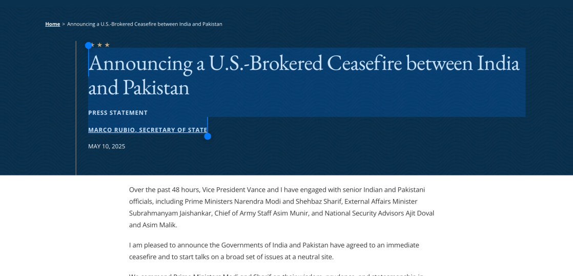 Announcing a U.S.-Brokered Ceasefire between India and Pakistan