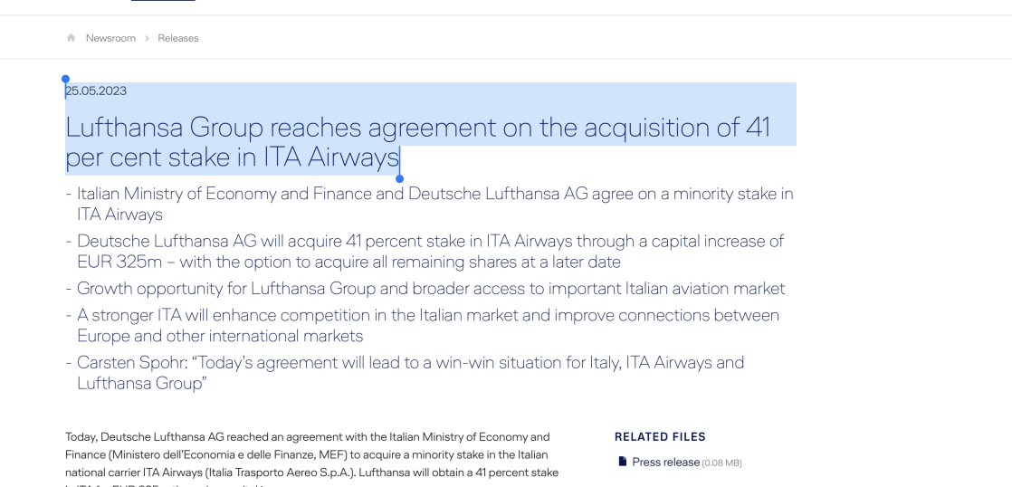 - Italian Ministry of Economy and Finance and Deutsche Lufthansa AG agree on a minority stake in ITA Airways