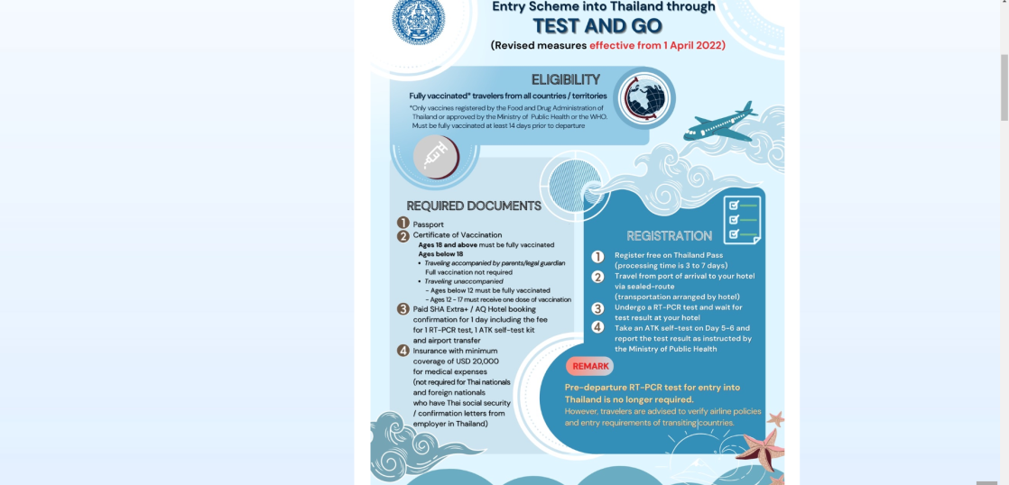 1. タイ渡航をご希望の方はThailand Pass 申請システム https://tp.consular.go.th (click) にて渡航予定日の7日前までにご登録が必要になります。Thailand Pass システムにて登録後 QRコードが発行されますので、チェックインカウンターでの搭乗手続き時、及びタイ到着時の入国手続き時にご提示下さい。