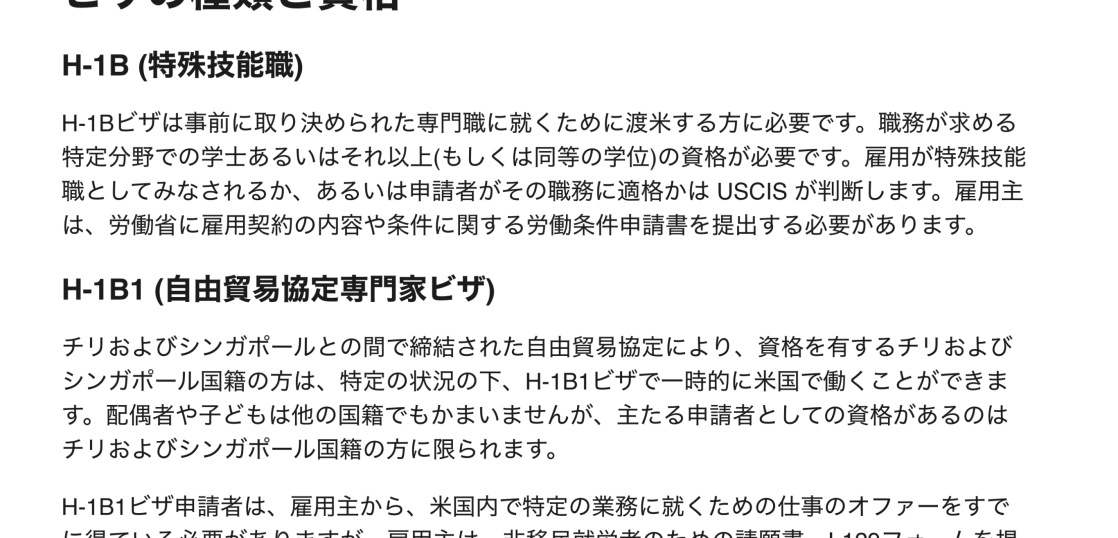 H-1Bビザは事前に取り決められた専門職に就くために渡米する方に必要です。職務が求める特定分野での学士あるいはそれ以上(もしくは同等の学位)の資格が必要です。雇用が特殊技能職としてみなされるか、あるいは申請者がその職務に適格かは USCIS が判断します。雇用主は、労働省に雇用契約の内容や条件に関する労働条件申請書を提出する必要があります。