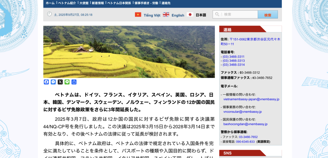 2025年3月7日、政府は12か国の国民に対するビザ免除に関する決議第44/NQ-CP号を発行しました。この決議は2025年3月15日から2028年3月14日まで有効となり、その後ベトナムの法律に従って延長が検討されます。
