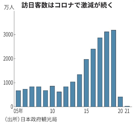 訪日客蒸発」の最大の要因は日本の入国制限だ。政府は新型コロナの水際対策として、20年末以降は原則としてすべての国・地域を対象に新規入国を停止。観光目的では入国できない状況が続く。