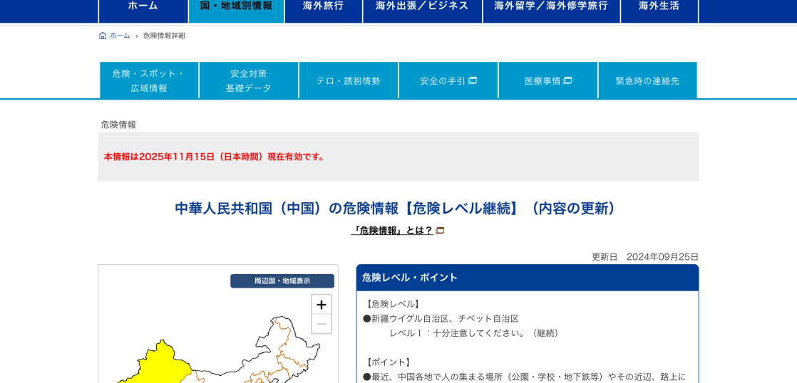 日本国外務省発令の海外渡航安全情報,中国への渡航情報から
