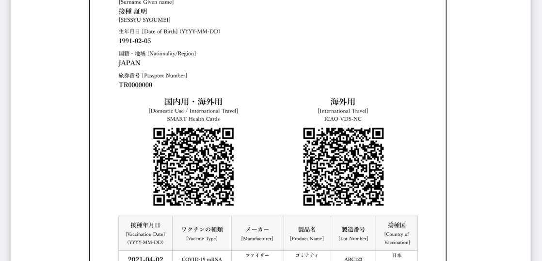 「パスポート情報等を記載した海外用及び日本国内用の接種証明書」と「パスポート情報等の記載の無い日本国内用の接種証明書」の2種類が、書面又は電子版で交付可能です。