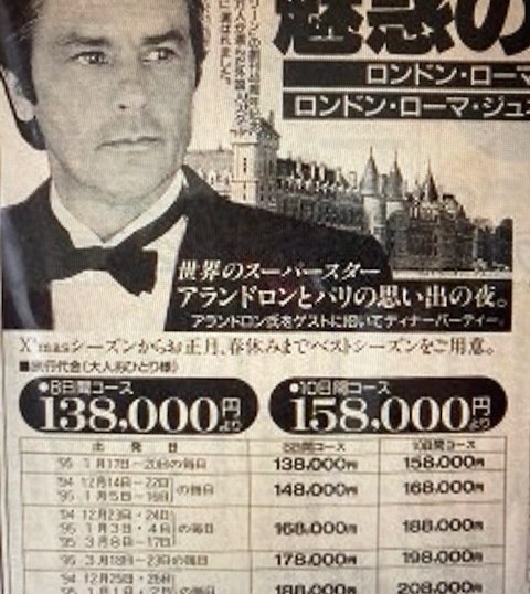 今の成功が在る阪急交通社の『新聞広告販売旅行商品』の礎が、ディナーショーに自身の映画がスクリーンに映し出されて、アランドロン本人が出てくるとディナー会場に悲鳴が・・そのツアー『魅惑のヨーロッパ』