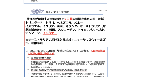 表題画像は12月6日に更新されている、【6日間の日本に帰国してからの強制隔離国】です …